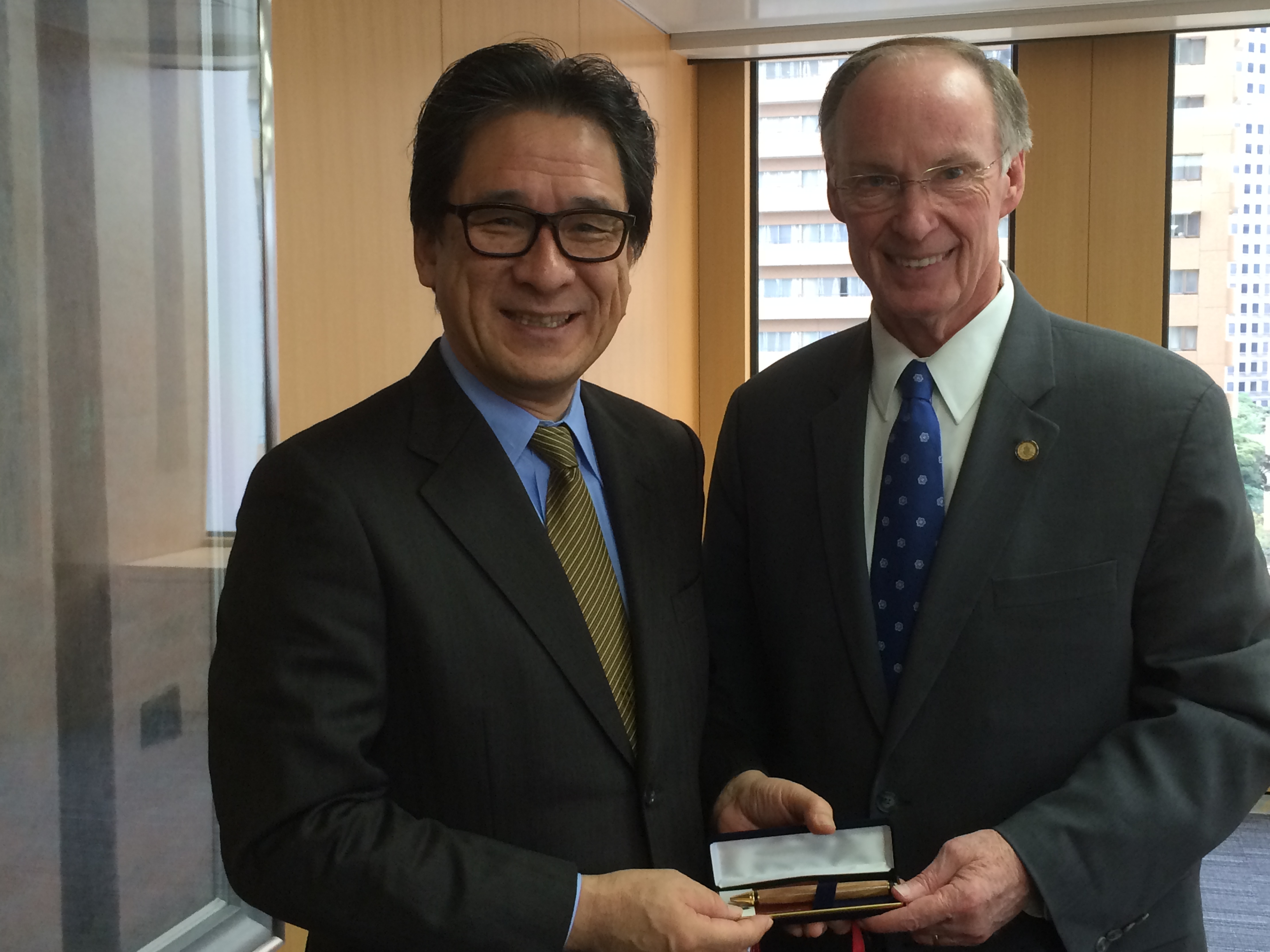Bentley met this morning with Hiroyuki Ishige, chairman and CEO of the Japan External Trade Organization (JETRO), a group that works to promote trade and investment. Bentley presented Ishige with a pen crafted from a dogwood tree downed by the April 27, 2011, tornado in Tuscaloosa.